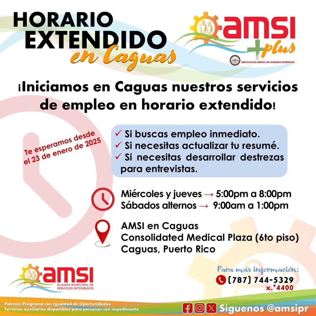 Las personas en búsqueda de empleo tendrán una nueva alternativa para identificar oportunidades laborales y recibir servicios de apoyo de la Alianza Municipal de Servicios Integrados, Inc. (AMSI) en horario extendido. La AMSI anunció el inicio de una nueva temporada de servicios de empleo en horario extendido comenzando el 23 de enero de 2025 […]