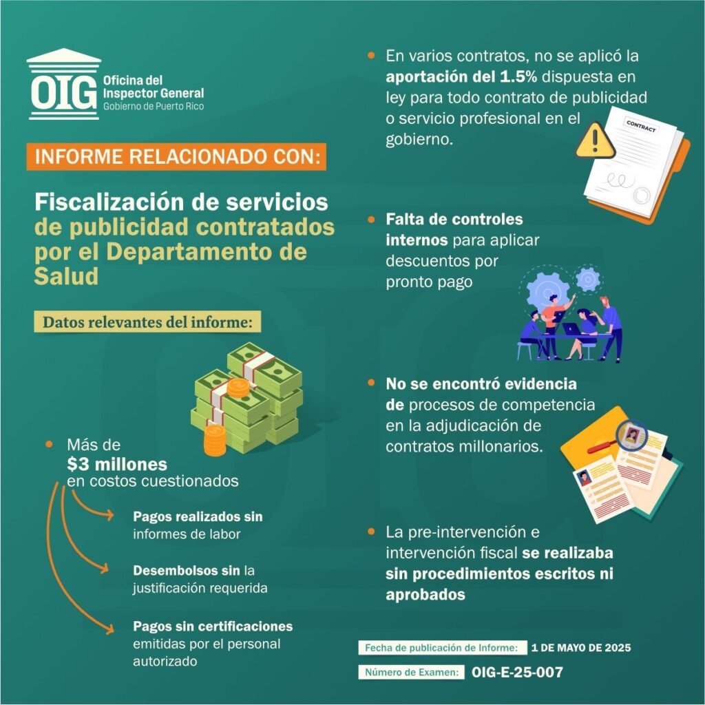 La Oficina del Inspector General de Puerto Rico (OIG), publicó un informe de examen relacionado con los gastos en contratos de publicidad formalizados por el Departamento de Salud (DS), incluyendo aquellos vinculados a la pandemia por el COVID-19. El informe detalla una serie de deficiencias en los controles internos, la fiscalización de pagos y el […]