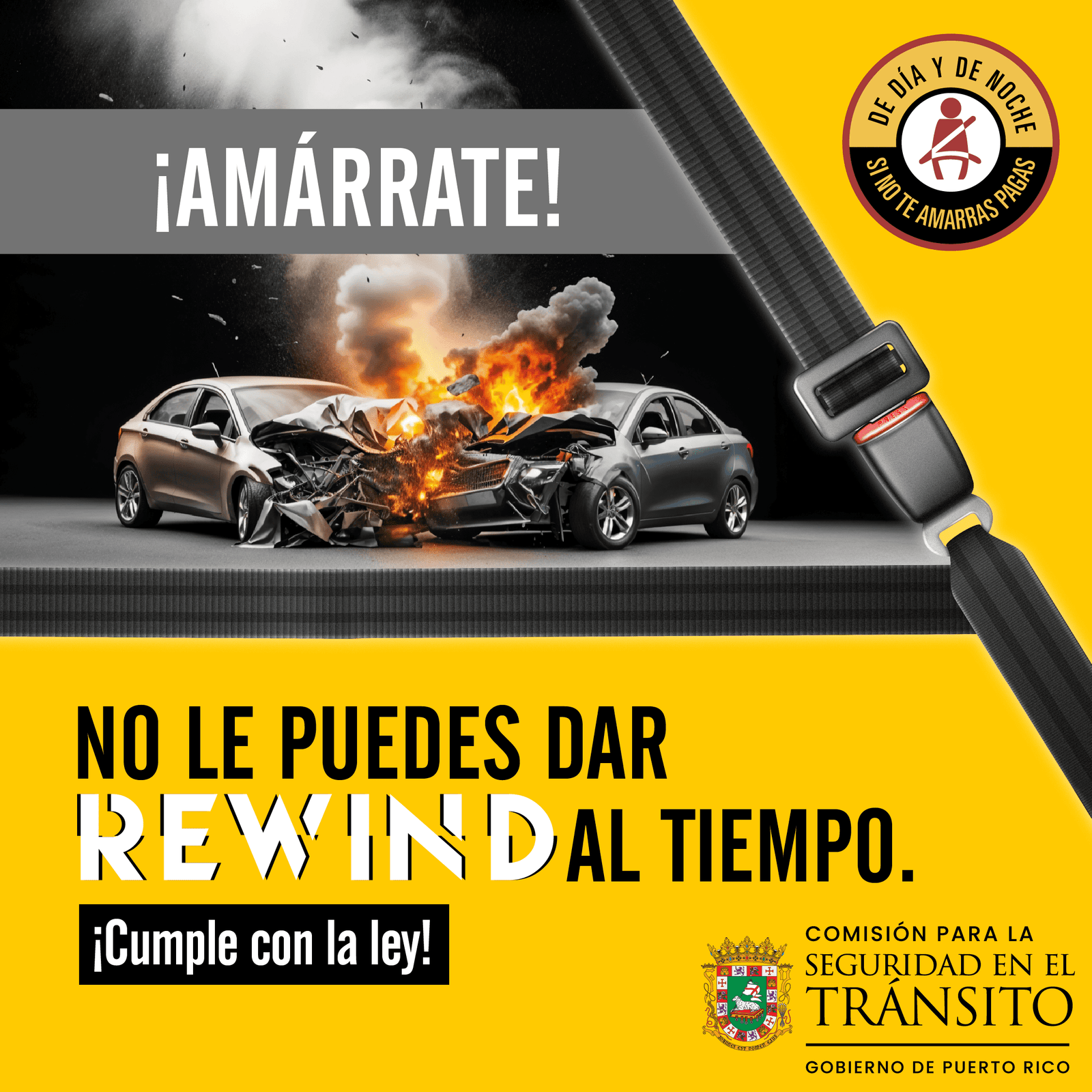 Con 91 muertes reportadas en 2024 por no usar cinturón de seguridad, la Comisión para la Seguridad en el Tránsito (CST) lanzó hoy su nuevo esfuerzo educativo con los lemas: “ ¡Amárrate!: no le puedes dar REWIND al tiempo ” y “ De día y de noche, si no te amarras, pagas ”. La iniciativa está dirigida a reforzar el uso del cinturón de seguridad en todos los ocupantes de vehículos, como parte de la campaña nacional liderada por la Administración Nacional de Seguridad del Tráfico en las Carreteras (NHTSA).