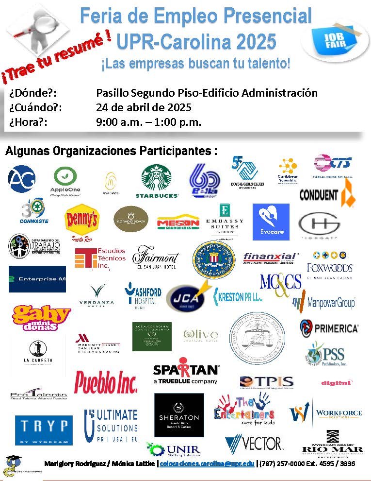 El Decanato de Asuntos Estudiantiles y la Oficina de Colocaciones de la Universidad de Puerto Rico en Carolina celebrarán el próximo jueves, 24 de abril, su Feria de Empleos 2025.