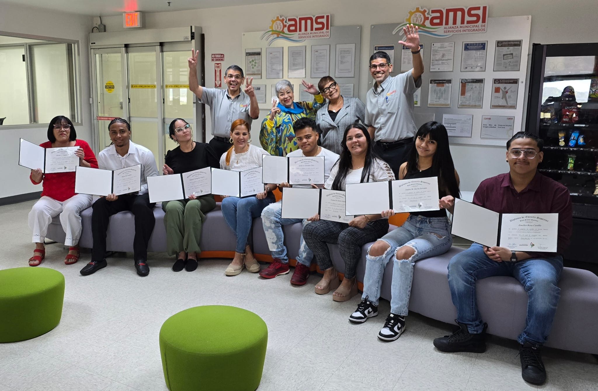 Los participantes celebraron con júbilo junto a familiares y amigos al recibir sus respectivos diplomas, luego de aprobar el examen de equivalencia de cuarto año ofrecido por el Departamento de Educación en AMSI en Caguas. Esta oportunidad de servicios libres de costo está disponible para personas mayores de 18 años como parte de una alianza de colaboración entre la Alianza Municipal de Servicios Integrados, Inc. (AMSI) y el Programa de Educación para Adultos del Departamento de Educación de Puerto Rico.