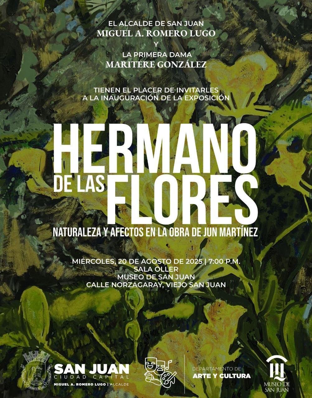 El alcalde de la ciudad capital, Miguel A. Romero Lugo, anunció la apertura de la exposición “Hermano de las flores: naturaleza y afectos”, del pintor puertorriqueño Jun Martínez, que se inaugurará mañana miércoles, 20 de agosto, a las 7:00 pm, en la Sala Francisco Oller del Museo de San Juan. La muestra, organizada por el Departamento de Arte y Cultura junto a esta institución cultural, reúne una veintena de obras al óleo en las que el artista explora su relación con la naturaleza puertorriqueña.