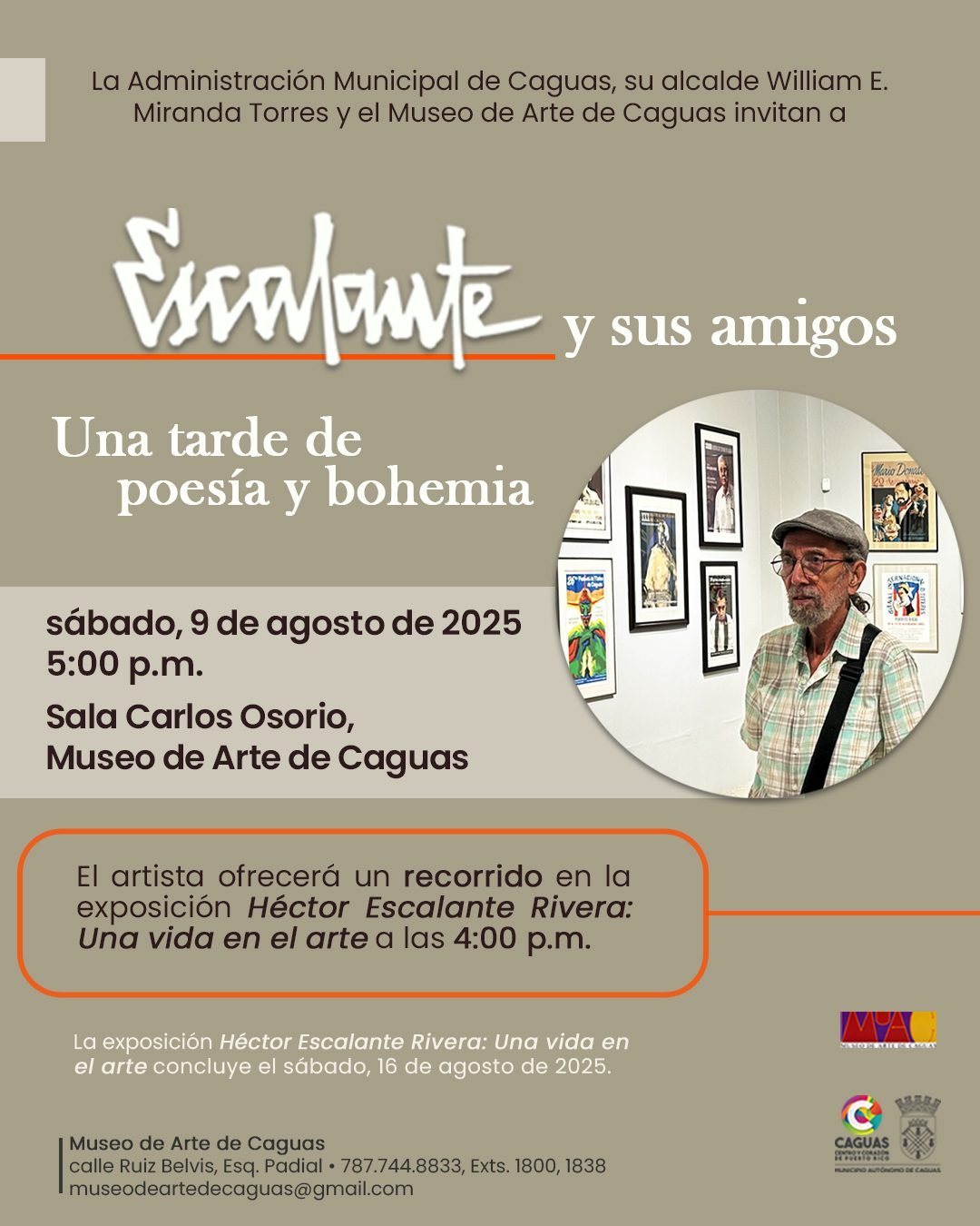 El alcalde de Caguas, William E. Miranda Torres y el Departamento de Desarrollo Cultural invitan a la ciudadanía a la actividad que celebra la música y la poesía, disciplinas que cultiva el artista Héctor Escalante Rivera a propósito de revisar la trayectoria fructífera del maestro en el contexto de la exposición Héctor Escalante Rivera: Una vida en el arte. La tarde de poesía y bohemia: Escalante y sus amigos se llevará a cabo el sábado, 9 de agosto de 2025 a las 5:00 p.m.