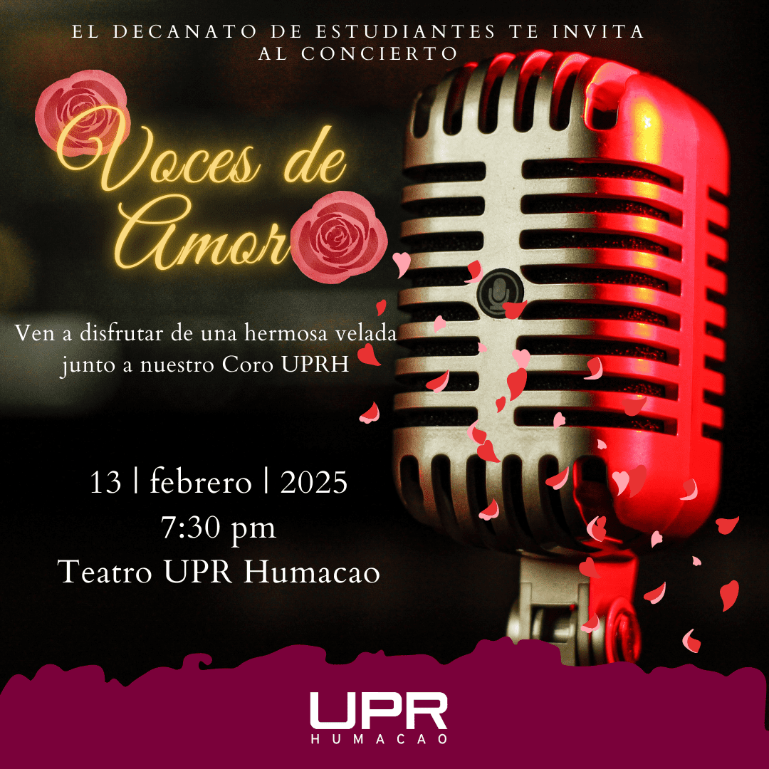 La Universidad de Puerto Rico en Humacao les invita al Concierto del Coro de Estudiantes titulado “Voces de Amor”. El evento será el jueves, 13 de febrero de 2025 a las 7:30 p.m. en el Teatro de la institución. La entrada es libre de costo y para el público general. Los esperamos en esta hermosa velada llena de música y emoción.